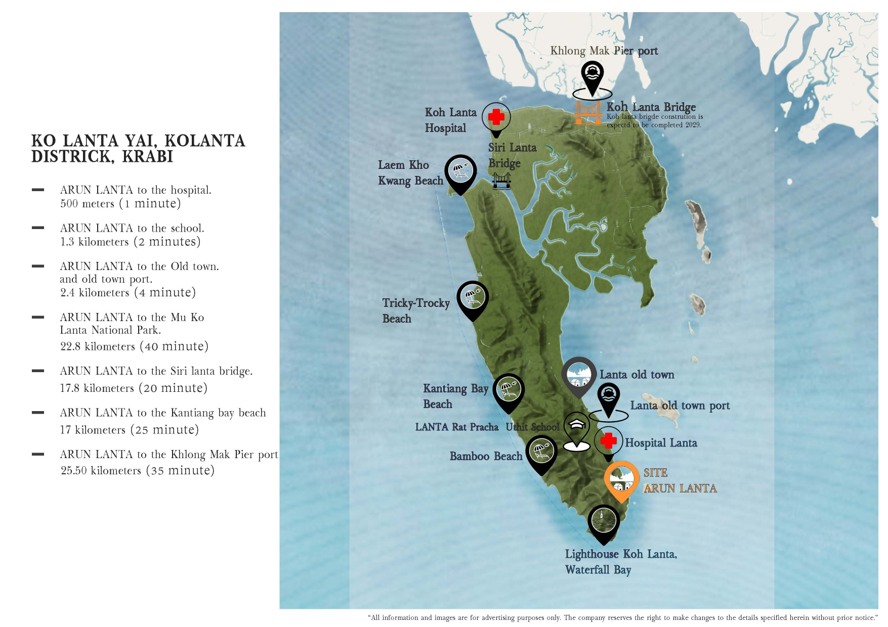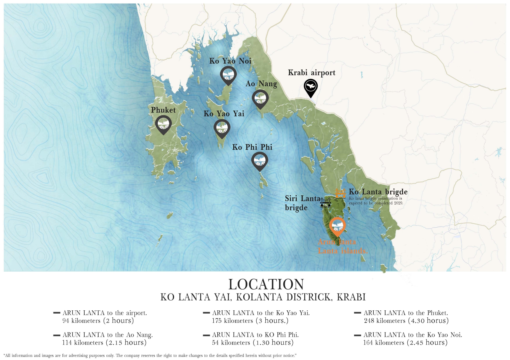 ARUN LANTA to the airport. 94 kilometers (2 hours),ARUN LANTA to KO Phi Phi. 54 kilometers (1.30 hours),ARUN LANTA to the Phuket. 248 kilometers (4.30 hours)